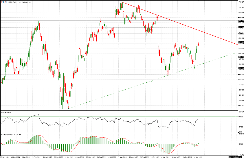 That concern was partially offset by robust operating momentum: ad impressions rose 18% year over year, while pricing increased 6%, providing sufficient earnings leverage to absorb higher investment. The decisive beat on both revenue and earnings triggered a ~10% surge in after-hours trading, reaffirming investor confidence in Meta’s execution. It is expected to open at $713.12, just at that red trendline.