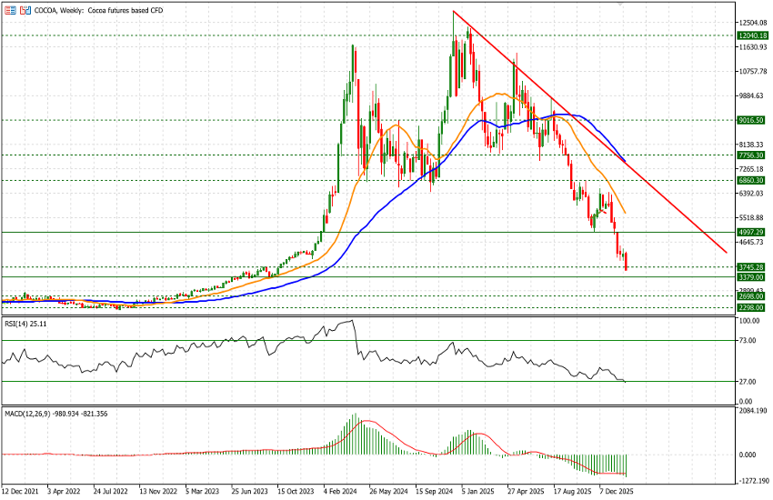 That said, identifying the correct timing to initiate long exposure in a sharply declining commodity remains challenging. Although the RSI is in oversold territory and the next downside level we have identified—USD 3,380—appears relatively close, it still implies an additional 7% move lower. For this reason, we would avoid assuming that price levels are attractive merely because cocoa has already fallen substantially. Instead, patience is warranted while monitoring for credible long signals, such as a break above prior relative highs.
