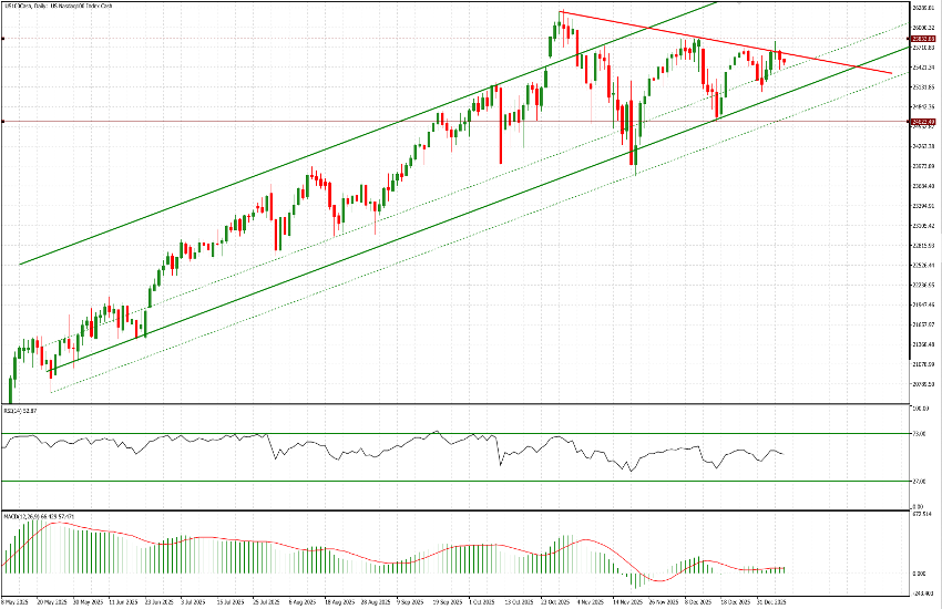 Volviendo al US100, lo que se ha venido configurando en los últimos meses—desde octubre—es un patrón de consolidación triangular (que algunos podrían definir como una bandera), cuya resolución determinará si el próximo movimiento direccional será alcista o bajista. El patrón se encuentra en una fase avanzada, ya que la distancia entre los límites superior e inferior continúa estrechándose y, según nuestro gráfico, debería converger completamente hacia la cuarta semana de enero (23 de enero). En la actualidad, el rango relevante está delimitado por 25.600 puntos en la parte superior y 25.050 puntos en la inferior. Con el índice cotizando en torno a 25.515, el precio se sitúa claramente más cerca del límite superior del triángulo, lo que implica un perfil de riesgo–beneficio menos atractivo para posiciones largas y relativamente más favorable para posiciones cortas.