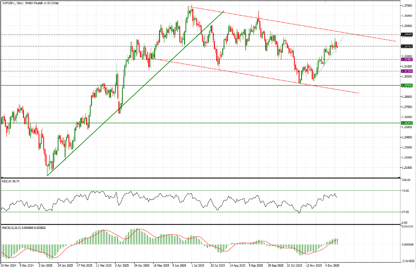 La zona de 1,2990, desde la que se inició la última aceleración alcista, constituye un nivel clave de soporte y resistencia. Fue especialmente relevante a comienzos de 2022, cuando —una vez perforada— dio paso a un rápido desplome del cruce, primero hacia el área de 1,20 y posteriormente hasta 1,0325 a finales de ese mismo año. La pendiente del rally iniciado el 20 de noviembre desde 1,3035 parece algo pronunciada, y ya ayer se produjo un primer intento de ruptura a la baja de la directriz alcista. Los indicadores de momento siguen siendo constructivos, con MACD y RSI en terreno positivo.