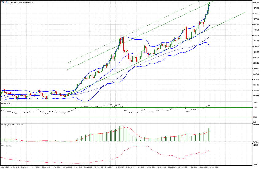 El canal alcista en el que se mueve el activo sugiere que la zona de los USD 5.000 —también un nivel psicológico clave— podría representar un objetivo a corto plazo. Asimismo, no puede descartarse una extensión hacia el área de USD 5.090. En cualquier caso, conviene tener presente que otra medida de volatilidad, el ATR, indica actualmente un rango diario cercano al 2%, equivalente a USD 93,63.
