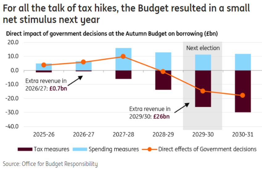 In addition, the recent Autumn Budget has, to some extent, cleared the way for monetary easing. Specific measures—such as cuts to energy bills and a freeze in train fares—are expected to shave a few tenths of a percentage point off headline inflation next year. More importantly, the timing and distribution of fiscal measures imply a modest “micro-stimulus” in 2026, with the bulk of fiscal support shifted further out along the policy horizon.