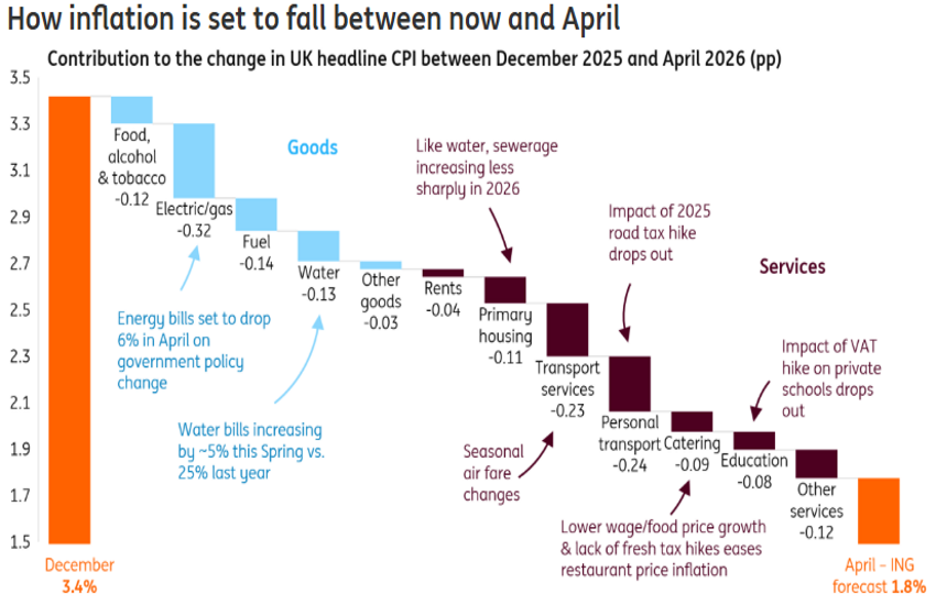 インフレ率は依然として先進国の中で最も高い水準にあり、現在は3.4%となっている。ただし、先行きはより前向きな見通しとなりつつある。CPIの主要構成要素を見ると、今後数か月にわたり明確なディスインフレが進む可能性が示されており、ヘッドラインインフレ率は4月までに2%近辺へ低下する可能性がある。公共料金(水道・ガス)、食品価格、住宅関連費用、輸送費はいずれも、現在から4月にかけて緩和が見込まれている(図表参照、出所:ING)。