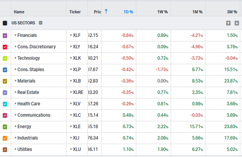It was another negative day, albeit only slightly so on Wall Street, but this time the “novelty” was that the most heavily sold sector was not technology, but financials. With a daily performance of -0.84%, financials saw greater selling pressure than consumer sectors (Discretionary -0.67%, Staples -0.42%), dragging down primarily the DJ30, which was the weakest among the major indices with a performance of -0.54%.