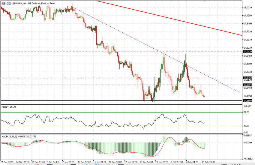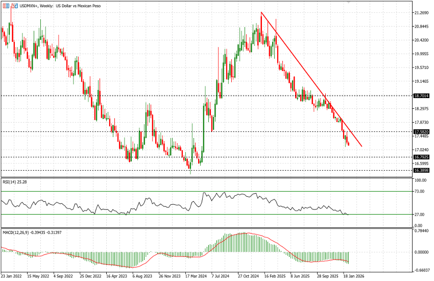 Since April 2025, USDMXN has been in a clear and sustained downtrend, declining from levels close to 21.00 to the current area around 17.17.
