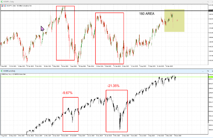 What we are presenting here is not exactly a classic “technical analysis,” but rather a chart designed to visualize the relationship between USD/JPY and the US500, overlaid horizontally on MT5. It is clearly observable that downside moves in USD/JPY—triggered by interventions from the MoF (Ministry of Finance)—have been decisive and have generally either preceded or coincided with declines in the US500 (and, more broadly, in all global risk markets).