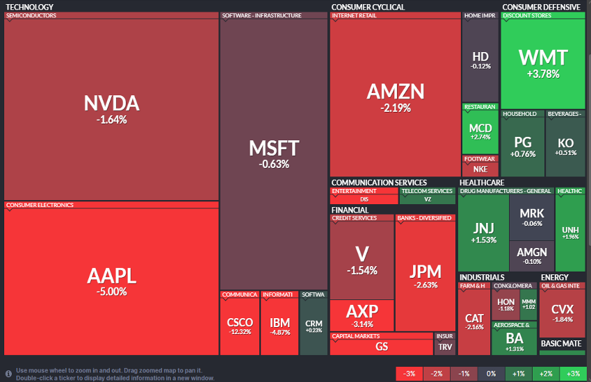 I mention this because yesterday, while the US30 retraced from its all-time highs with a -1.34% pullback, the Dow Jones Transportation declined sharply by -4.04%. It is important to note that the losses in the US30—as visible in the heat map below—remain largely attributable to big tech. Apple Inc. recorded its worst day in nearly a year, and the only sectors in positive territory were Consumer and Health Care.