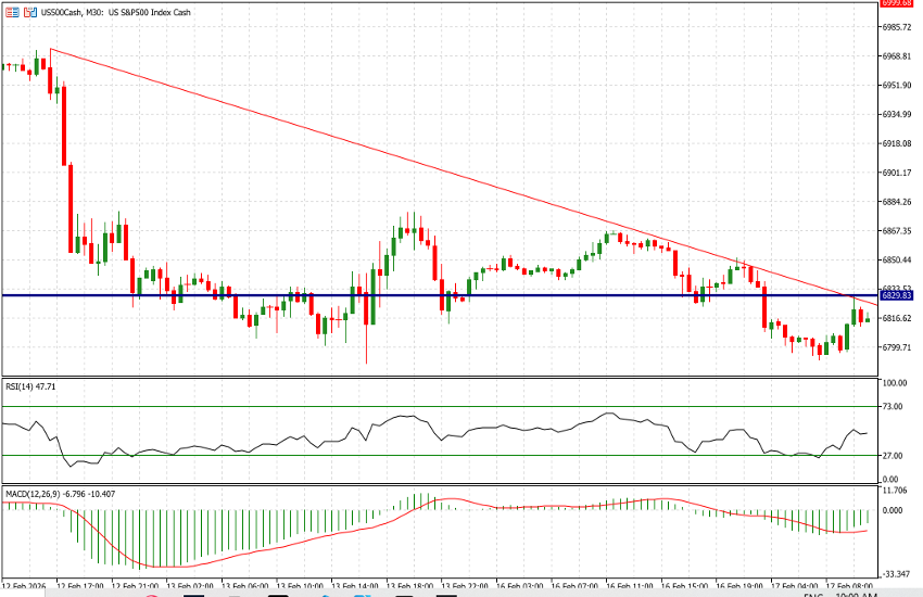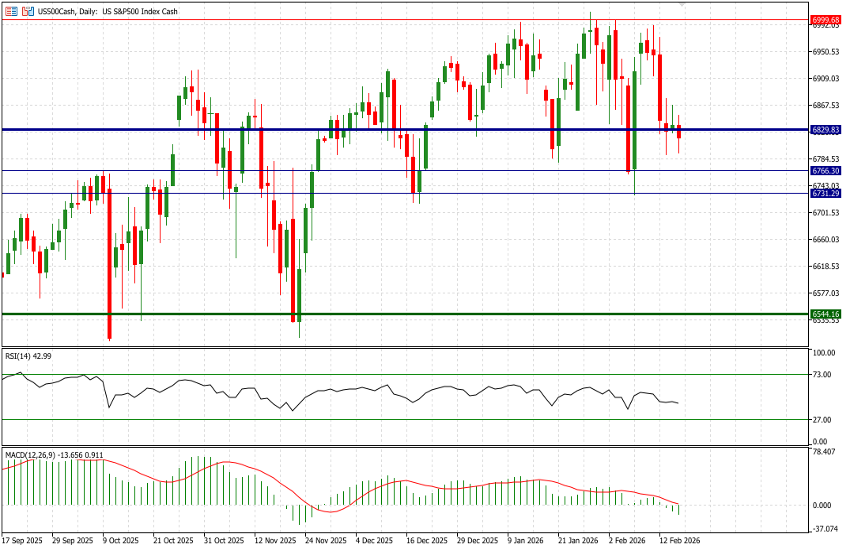 It has not been a good month so far for the US500 (S&P 500), and we are only on February 17. The index’s month-to-date performance currently stands at -1.48%, which has also pushed the year-to-date return into negative territory (-0.33% as of last Friday’s close at 6,836). This morning, following yesterday’s market holiday, the index is down an additional 0.18%.