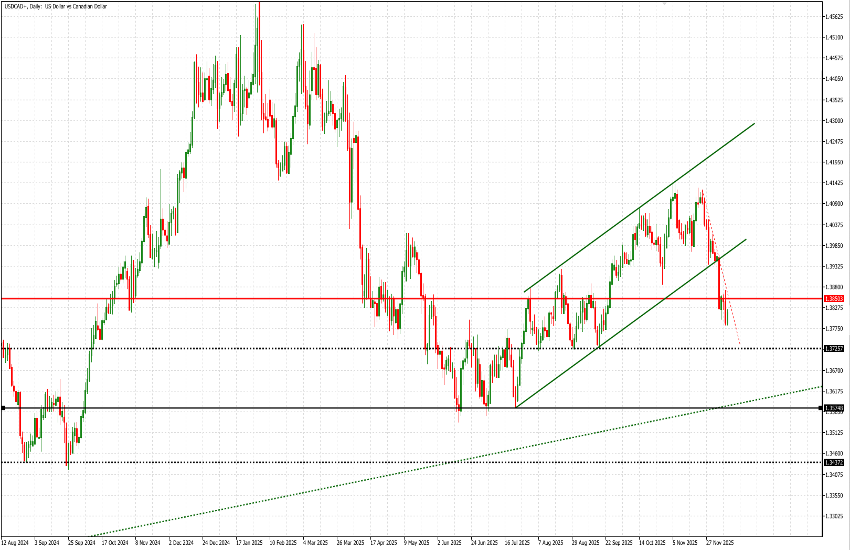 The pair has been accurately reflecting the underlying political and macroeconomic dynamics in its price action. The Canadian dollar weakened from 1.3419 in September 2024 to a January low of 1.4560, driven by the Bank of Canada’s easing cycle. It subsequently recovered meaningfully, with USD/CAD falling to 1.3566 in June of this year, as reduced demand for U.S. dollars translated into depreciation of the greenback. After roughly a month of consolidation, the U.S. dollar resumed its advance on July 23, and the pair traded within a well-defined upward channel. This structure, however, broke down on December 5, when—ahead of yesterday’s respective central bank rate decisions—the trend was breached to the downside at 1.3956. Yesterday’s closing settlement printed at 1.3790.