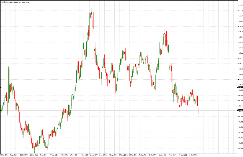 After months of relatively subdued volatility in FX markets, conditions have shifted abruptly. Over the past four sessions, the USD Index has recorded its worst performance since April 2025 (the days following the initial tariff announcements). With a -0.83% decline yesterday, the greenback has depreciated to levels last seen four years ago, in February 2022. Both the intraday low at 95.21 and the close at 95.45 are well below the 96.40 floor (support) that had held consistently since May 2025.