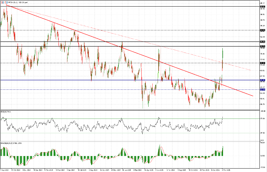 Chasing price is generally a poor strategy, even in situations where seemingly clear news flow dominates the market. The $78.75–$80.50 area represents fairly strong resistance, and the RSI is now in overbought territory (although too much weight should not be placed on that alone). Of course, an immediate further breakout is possible, which could quickly push prices toward $85; and in a wartime scenario, we would not even rule out $94. However, we believe a pause is likely for now—perhaps even a short technical correction toward $72.50.